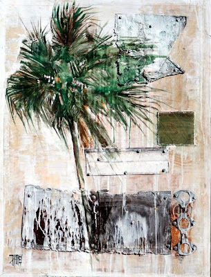 The artist bases his work on collage techniques, adding a variety of recollected materials into his paintings (as metal, iron, screws, cables, driftwoods etc.).